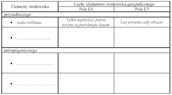 Zadanie 2. (3 pkt) Na podstawie mapy zapisz przebieg trasy, którą można najszybciej samochodem osobowym dojechać ze szkoły w Jastrzębiku (D2), do szpitala miejskiego w Krynicy (D4). W opisie uwzględnij: kierunek jazdy i orientacyjne punkty, w których go zmieniamy, rodzaj lub numer drogi. ....................................................................................................................................................... ...................................................................................................................................................... ....................................................................................................................................................... ....................................................................................................................................................... ....................................................................................................................................................... ...................................................................................................................................................... Zadanie 3. (1 pkt) Czerwony szlak turystyczny na odcinku z Jaworzyny (C2) na Runek (B1) biegnie: A. grzbietem górskim. B. doliną potoku. C. żlebem. D. wąwozem. Zadanie 4. (4 pkt) Porównaj środowisko geograficzne w polach E4 i E5 uzupełniając tabelę według podanego przykładu oraz zapisz wniosek uogólniający, wynikający z tego porównania.