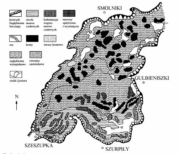 Zadanie 3. (1 pkt) Na profilu wpisz nazwy dwóch jezior, przez które przepływa Jacznówka. Zadanie 4. (2 pkt) Opisz skalę pionową profilu, wpisując w oznaczone miejsca przy osi pionowej odpowiednie wartości. Przedziały skali na osi pionowej zaznaczono co 10 m. Zadanie 5. (2 pkt) Liczne wzniesienia występujące na obszarze Suwalskiego Parku Krajobrazowego (SPK) mają dwojaką genezę. Porównaj poniższą mapę geomorfologiczną z kolorową mapą SPK i napisz, jakiego pochodzenia są niżej wymienione wzniesienia: Góra Tabaczyna..............................................., Góra Zalewki .................................................., Góra Walik......................................................., Góra Cmentarna...............................................