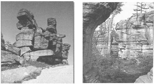 Zadanie 1. (3 pkt) Uzupełnij zdania nazwami obiektów geograficznych położonych na obszarze Parku Narodowego Gór Stołowych lub w pobliżu jego granic. Najwyższym szczytem Gór Stołowych jest a) .................................................................. (919 m n. p. m.), który wznosi się na północ od miejscowości b) ................................. . Na wierzchowinie, w bliskim sąsiedztwie Kręgielnego Traktu, znajduje się rezerwat przyrody c) ....................................................................................., a na SE od tego rezerwatu wznosi się skała d) ..................( 751 m n.p.m.). Przez południowo-wschodnią część Parku Narodowego Gór Stołowych płynie potok e)................................................., a na południe od niego rozciąga się niezbyt wysoki, wznoszący się na wysokość 733 m n.p.m., f) ................................................ Zadanie 2. (3 pkt) Spośród podanych zdań wybierz i podkreśl tylko te, które są prawdzie i charakteryzują Góry Stołowe. A. Góry Stołowe to typowe góry o budowie płytowej. B. Najważniejszą skałą Gór Stołowych jest bazalt. C. Góry Stołowe charakteryzuje inwersyjna budowa rzeźby. D. Góry Stołowe mają budowę płaszczowinową. E. Kształty form skalnych w Górach Stołowych to skutek wietrzenia chemicznego. F. Góry Stołowe zbudowane są z piaskowca ciosowego. Zadanie 3. (3 pkt) Korzystając z zamieszczonych fotografii oraz mapy, podaj trzy elementy rzeźby, charakterystyczne dla obszaru Parku Narodowego Gór Stołowych.